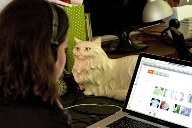 Actually, this is a tale of 17+ kitties, to be exact. I’m freelancing at an advertising agency this week and am enjoying the corner cubicle of someone who has the good fortune of a full-time job with paid vacation time (sigh…). Like any good armchair sociologist, I looked around her space today to get a better idea of who its resident is. Granted, I have no idea who she is, but I do know that she is married with four cats, a dog and a husband. How do I know this? During my inspection of her cube, I noticed several framed photos of her beloved furbabies and only one of her husband, in addition to several cartoons and clipped photos of cats, her cat calendar and an usual amount of kitty knick-knacks. In fact, the feline artifacts seemed to multiply during the day. I may have unwittingly stumbled into the cube of a crazy cat lady.