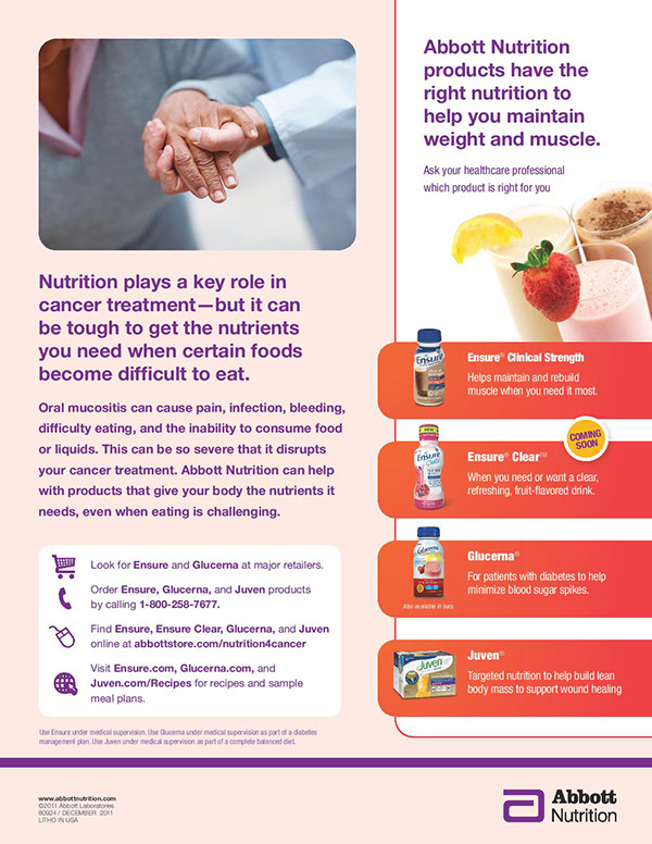 Maintaining good nutritional status and muscle mass is important for people with cancer who are undergoing treatment, which is why our team was tasked with creating a series of deliverables that were geared toward both healthcare providers and patients. While working with the Oncology division at Abbott Nutrition, I worked on several patient-facing pieces, such as brochures, a cookbook, and sheets that provided critical information about side effects caused by chemotherapy, in addition to pieces that demonstrated to physicians the critical role that nutrition plays in cancer recovery.