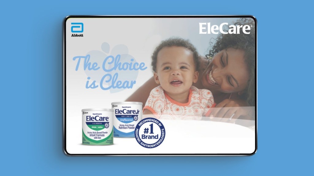 Dietary protein intolerance is when a child cannot properly digest specific proteins in the foods they eat. This causes extreme discomfort to the child and is frustrating for both the parent and physician to treat. With the goal to generate greater awareness and engagement around the benefits of EleCare, a new brand strategy was developed for Abbott Nutrition to position the product as a hypoallergenic nutrition powder to help infants and toddlers with hydrolyzed protein digestive problems.