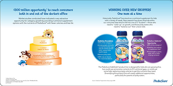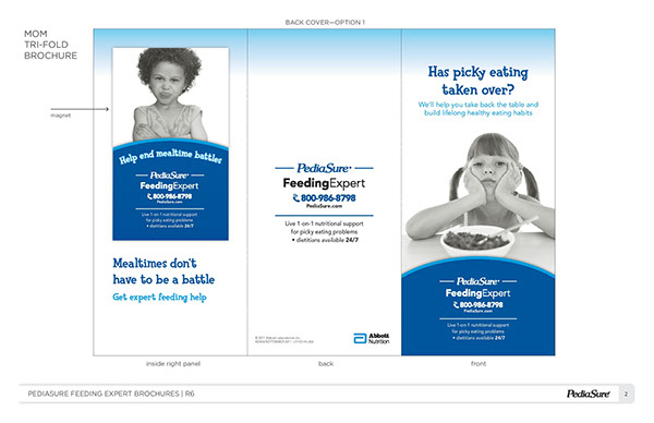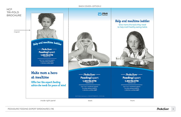PediaSure is a pediatric nutrition product that is manufactured by Abbott Nutrition to help children who either need to gain weight or need additional nutrition. When marketing this product, our team was tasked with speaking to a variety of stakeholders: parents, physicians, and sales representatives. To reach the consumer, we created brochures, print ads, web content, and point-of-sale pieces, such as shelf talkers, blades, and floor displays. For the pediatrician, we created mostly print materials, in addition to a sales aid that assisted sales representatives speak to physicians and encourage them to recommend PediaSure.